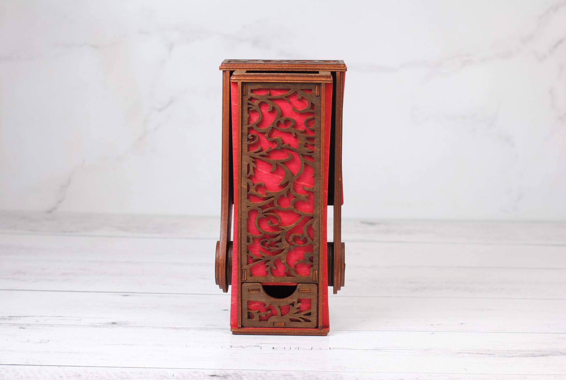 Featuring a magnetic drawer at the back, this tower offers convenient storage for your dice, keeping your gaming space organized and stylish. Whether you’re at home or on the go, this dice tower is the perfect companion for any RPG or board game session. Experience the perfect blend of craftsmanship and practicality—roll in style!
