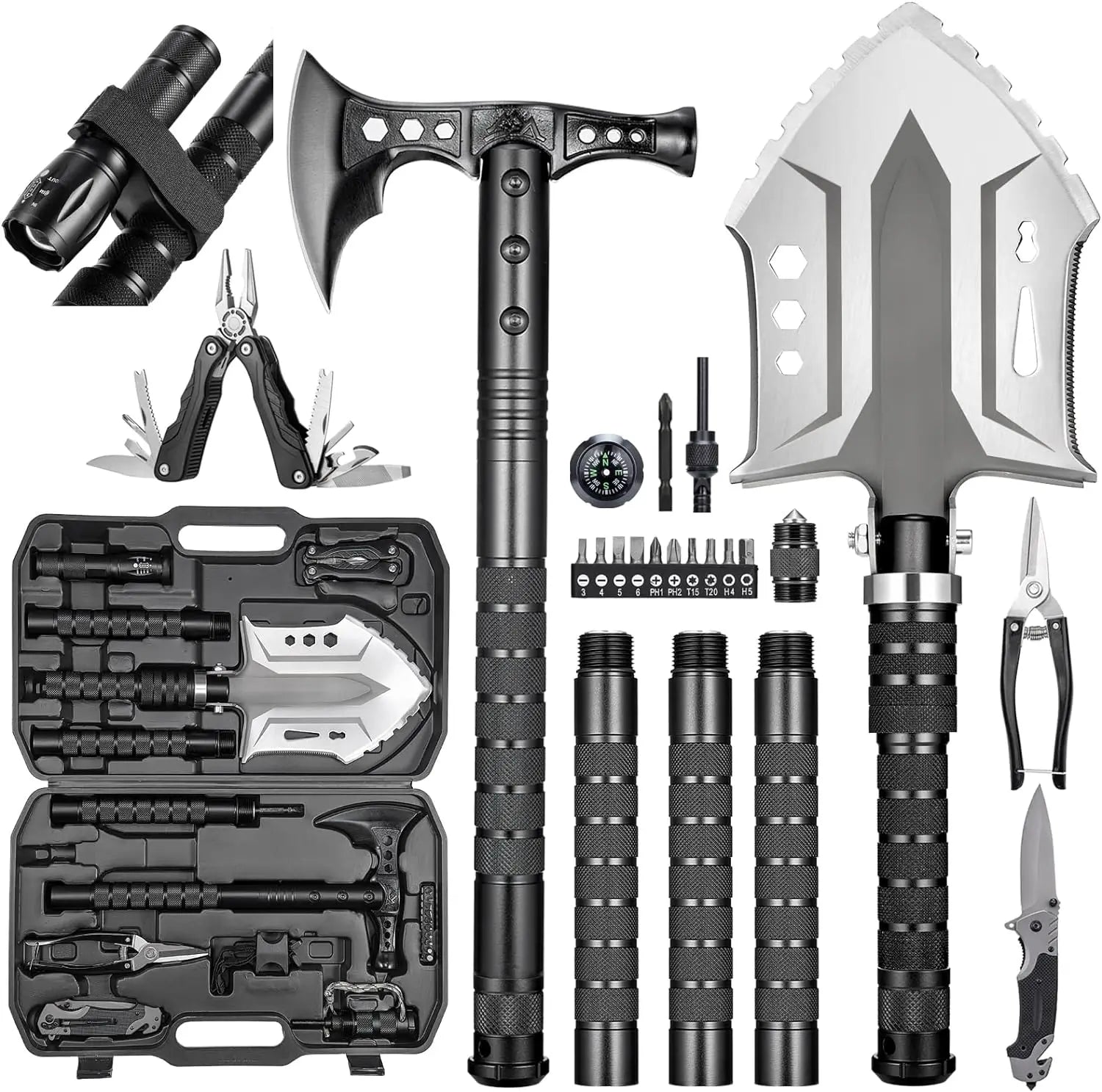 This survival shovel set integrates 28 essential tools including a shovel axe saw hoe flashlight hunting knife scissors hex wrench bottle opener whistle compass screwdriver set window breaker and more. Whether you are digging fire pits clearing trails cutting wood repairing gear or handling emergencies this tool adapts instantly to your needs.